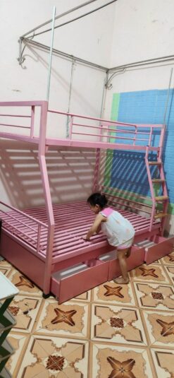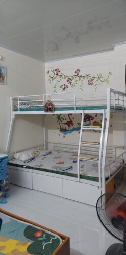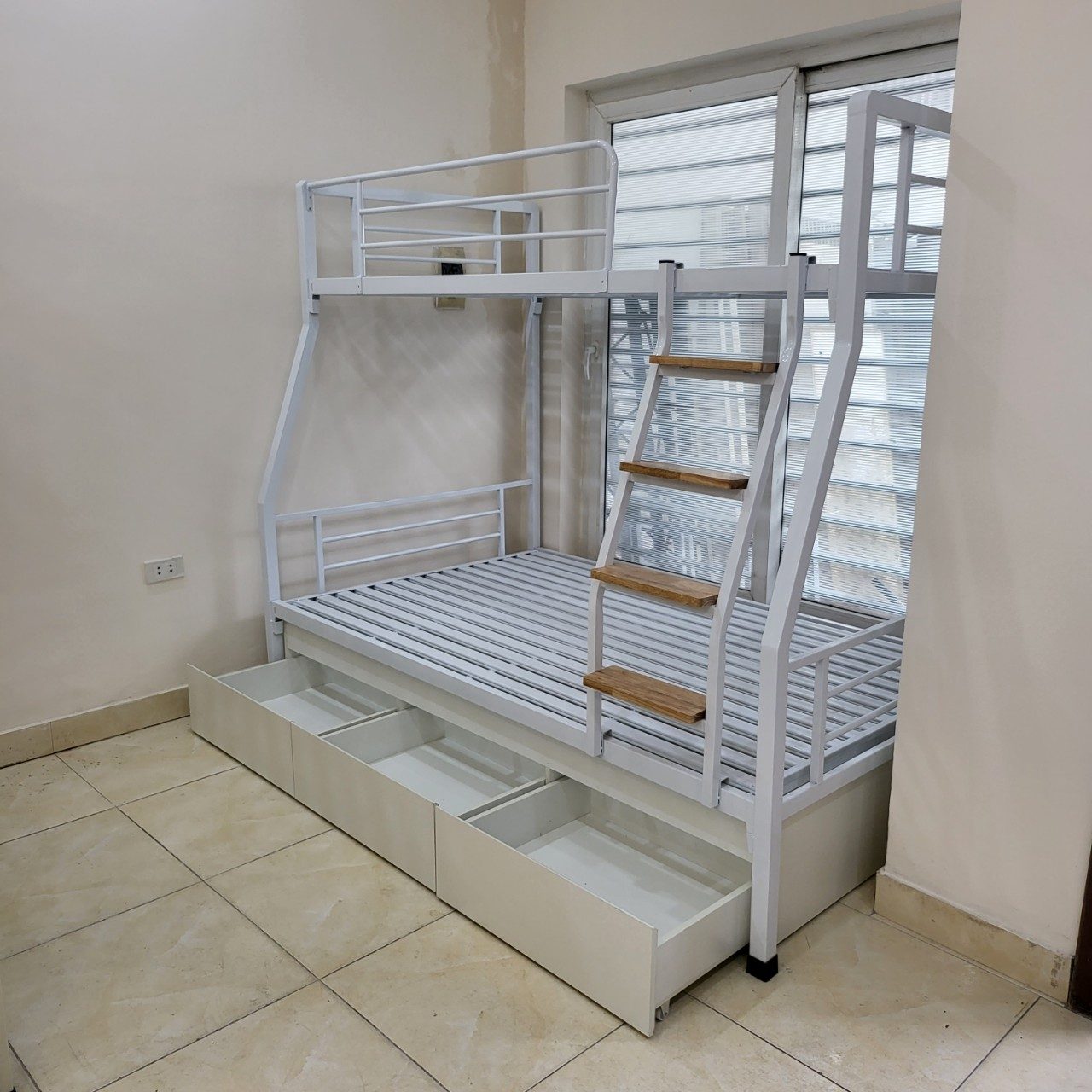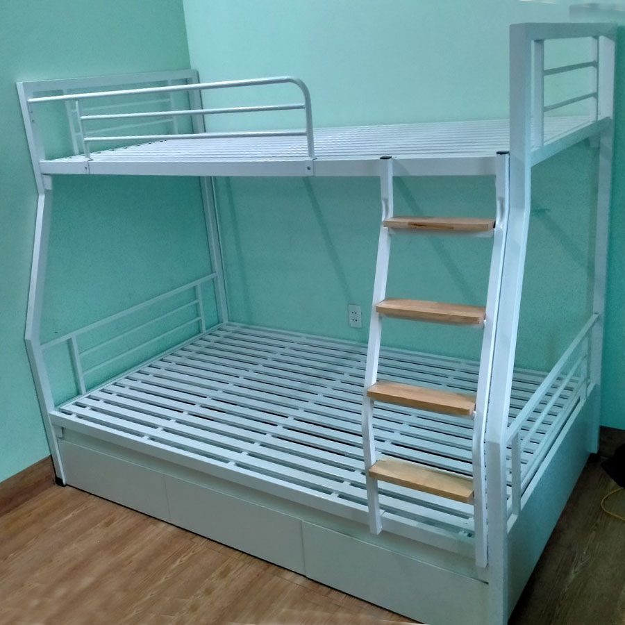 Giường sắt lệch tầng 1m2 thang leo rất tối ưu, leo tầng 2 vô cùng dễ dàng và an toàn, thích hợp cho phòng ngủ, gia đình hoặc homestay, đa dạng kích thước sẽ làm cho không gian của bạn sẽ gọn gàng và tiện nghi hơn. Thích hợp cho nhà trọ, khu ký túc xá, khu tập thể công nhân, trường du học và xuất khẩu lao động, sử dụng cho phòng trọ mang lại không gian gọn gàng tiện dụng.